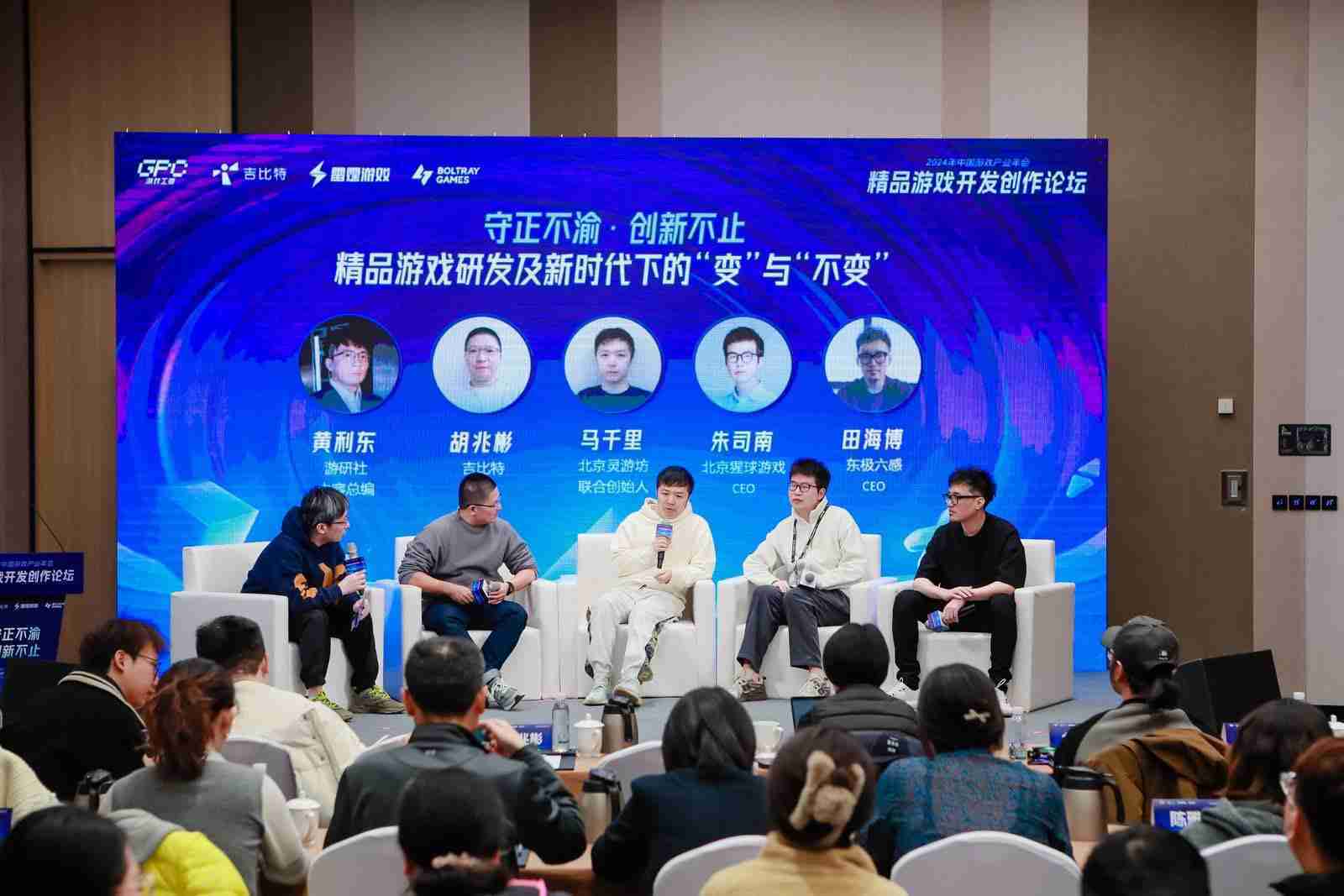 圆桌对话环节,,在游研社内容总编黄利东的主持下,,1winCTO胡兆彬、、、北京灵游坊联合创始人马千里、、、、北京猩球游戏CEO朱司南、、、、东极六感CEO田海博等四位嘉宾围绕“守正不渝、、、创新不止——精品游戏研发及新时代下的‘变’与‘不变’”这一主题分享了各自在精品游戏开发理念及工程能力搭建方面的见解和经历,,,,并就行业变化下游戏人需要坚守的理念等展开交流探讨。。。