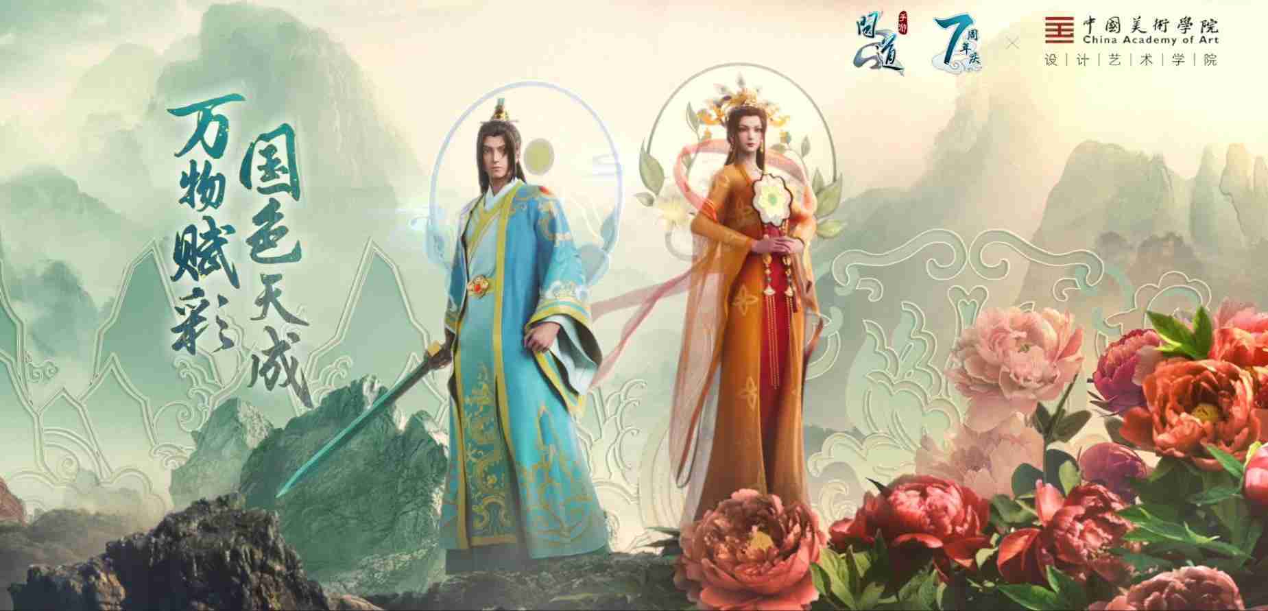 2023年4月,,,,《问道手游》联动中国美术学院,,,在游戏中融合了中国历史上不同时期的文化元素,,打造了“山河万象”与“凤鸣九霄”的国风时装。。。。在色彩配置方面,,创作团队基于对游戏角色特性的分析提取相应的文化内涵,,,从每一种色彩的色相、、、指代事物和情感出发对应角色属性,,,,选定服装的色彩搭配。。。在纹样设计方面,,创作团队结合游戏角色自身特殊的造型比例和形态,,在实际的纹样设计中进行了游戏语境下的活化演绎。。男性角色集中使用了如蟒纹、、海水江崖纹、、、如意纹和云气纹等传统纹样元素,,,女性角色则吸纳了凤凰纹、、、、牡丹纹、、、卷草缠枝纹等元素,,组成以“双凤牡丹纹样”“缠枝牡丹纹”“金玉凤冠头饰”为主要纹样的游戏角色装饰图案系统。。